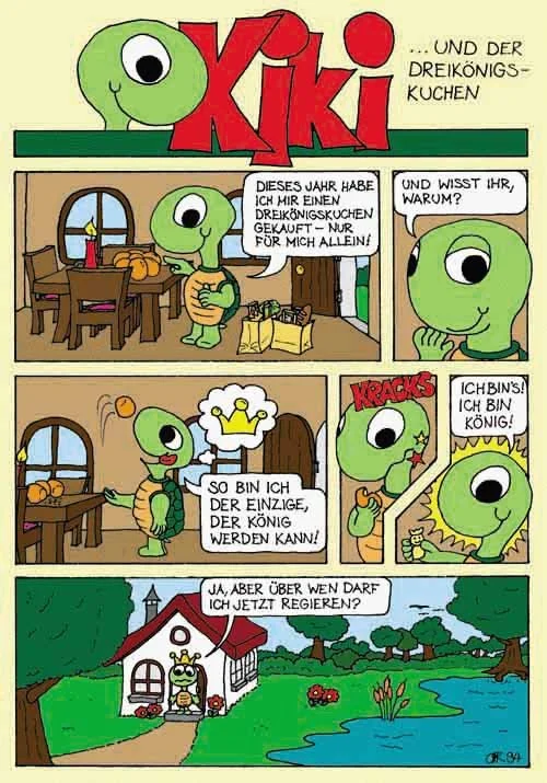 Kiki ist auch eine grüne Schildkröte. Zusammen mit ihren Freunden erlebt sie in jeder Ausgabe lustige Abenteuer. Wenn es einmal Streit oder ein Problem gibt, findet Kiki immer eine gute Lösung.