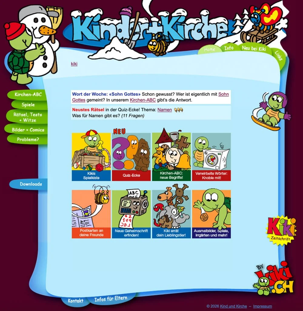 Kiki.ch bietet Kindern von 6 bis 9 Jahren Spiel und Spass rund um die Kirche. Sie finden Spiele, Quiz, ein Kirchen-ABC, Geschichten, Comics, Rätsel, Witze. Der Download-Bereich enthält eine Fülle von Puzzles, Ausmalbildern und Spielvorschlägen. Kiki, die lustige Schildkröte, begleitet durch die Seiten.